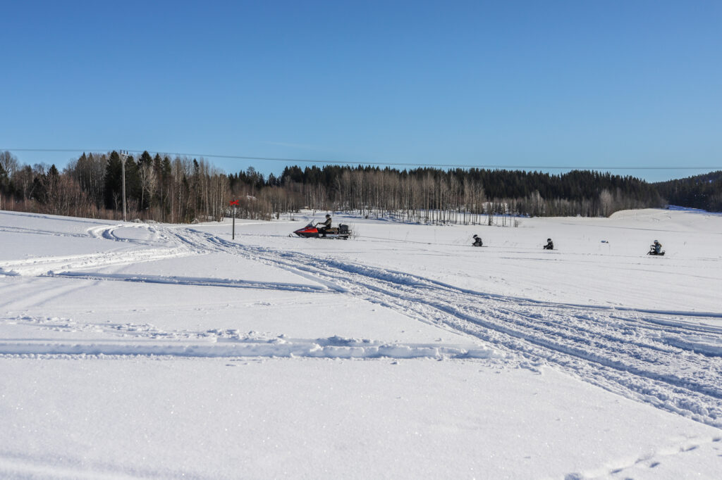 Storebror med tre småsyskon i släptåg. Vilken lycklig syn, menar mamman som stod med Lillan i barnvagnen här på skoterleden och hejjade på.