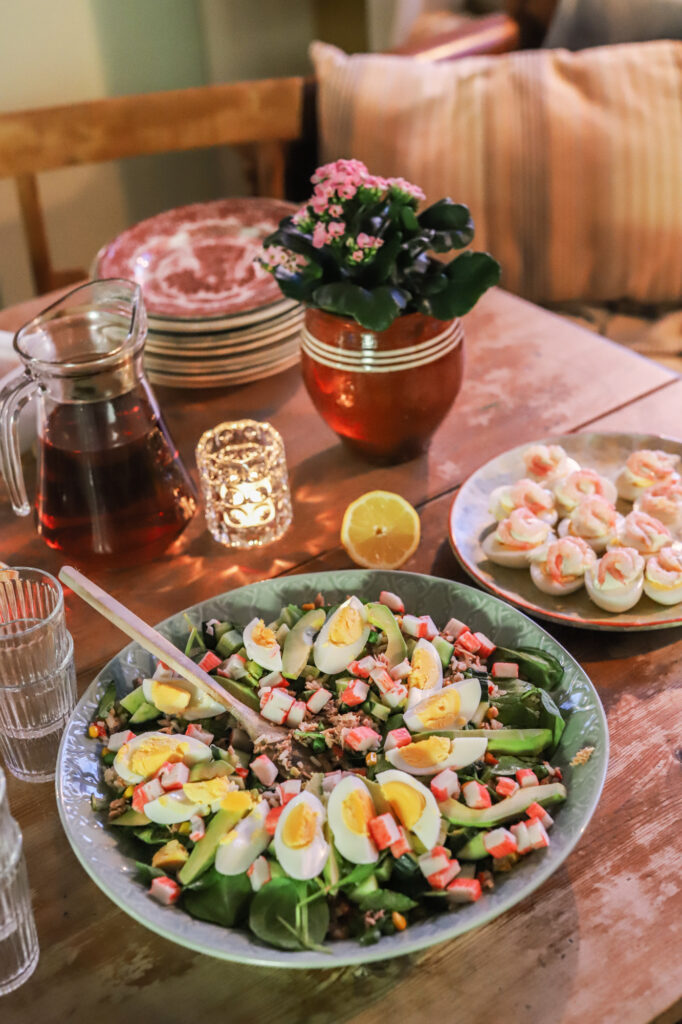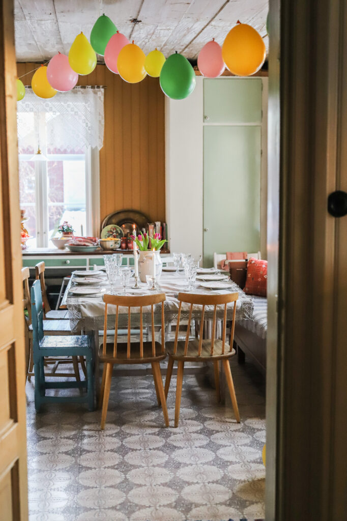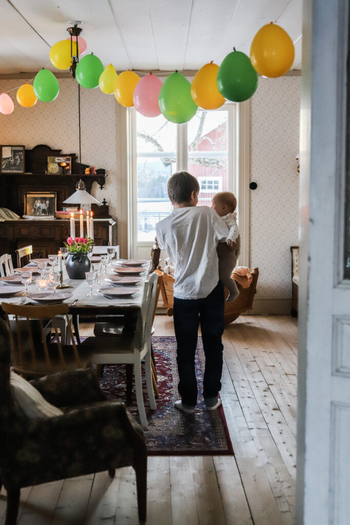 När det blev sportlovslördag hade vi tagit i från tårna och fixat kalas med storfamiljen. När vi möts upp ”bara närmsta familjegänget” så blir vi nånstans mellan 25-30 personer. Rikedom, säger jag! Det var dukat här och där. Lillen hade dukat med ett pyttebord med fyra småstolar runt, där han och hans tre småvänner satt. För gulligt.