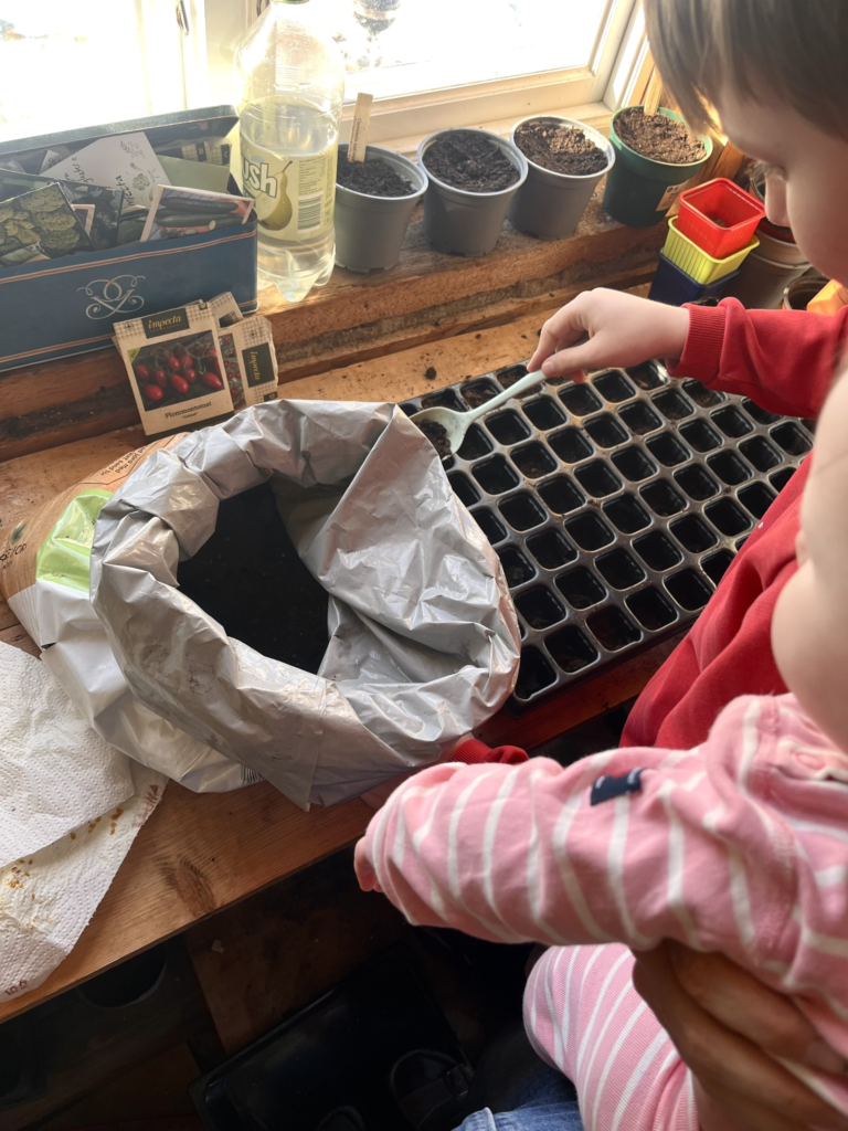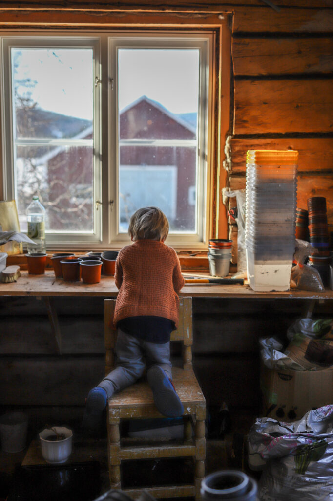 Det här är också ett sådant februari-håller-på-att-bli-mars-tecken. Pelargonerna väckta och samtliga blommor i hemmet har fått ny jord. Och som svar på frågan ”hur får ni saker gjorda med så många barn?”. -Vi låter de vara med på allt! (som inte är farligt för dom).