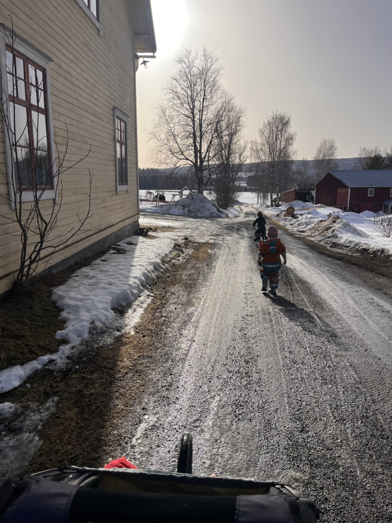 Tjava med barnvagnen på hårda skoterspår mitt på dagen. Eller spara promenaden till lite senare.. för nu stannar faktiskt solen, ända till efter 15. Samma eufori varje år, när vi kan konstatera att ”mäh! Nu är det till och med ljus kvar trots att klockan är fyra!?”. Nu är vi där.