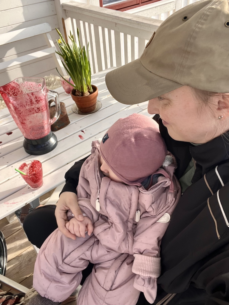 …. och poff! har det nu gått några dagar sedan jag skrev orden här ovan. Jag hann aldrig avsluta inlägget. Så kan det vara! Nu är det helg. Sista februari-lördag med flera plusgrader, knallblå himmel och strålande sol.. takdropp.. ljudet av skotrar som far över lägdorna genom byn. Vi har kunnat vara ute hela familjen, hela dagen. Sjuklingar mår bättre, mao. Inte helt friska, men på bättring. Enormt tacksamt. Det var helt magiskt att slänga sig i en snödriva och känna värmen från solen. Amma lillan sittandes där i solgasset. Livet återvänder! Hallelujah! Det vore så otroligt gott nu, om sportlovet fick vara friskt och återhämtande.